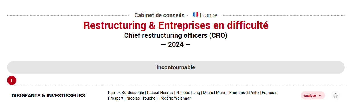 Toute l’équipe de D&I – Dirigeants & Investisseurs – emmenée par Patrick Bordessoule – est heureuse de retrouver la tête du classement 2024 de Leaders League des CRO (Chief Restructuring Officers).